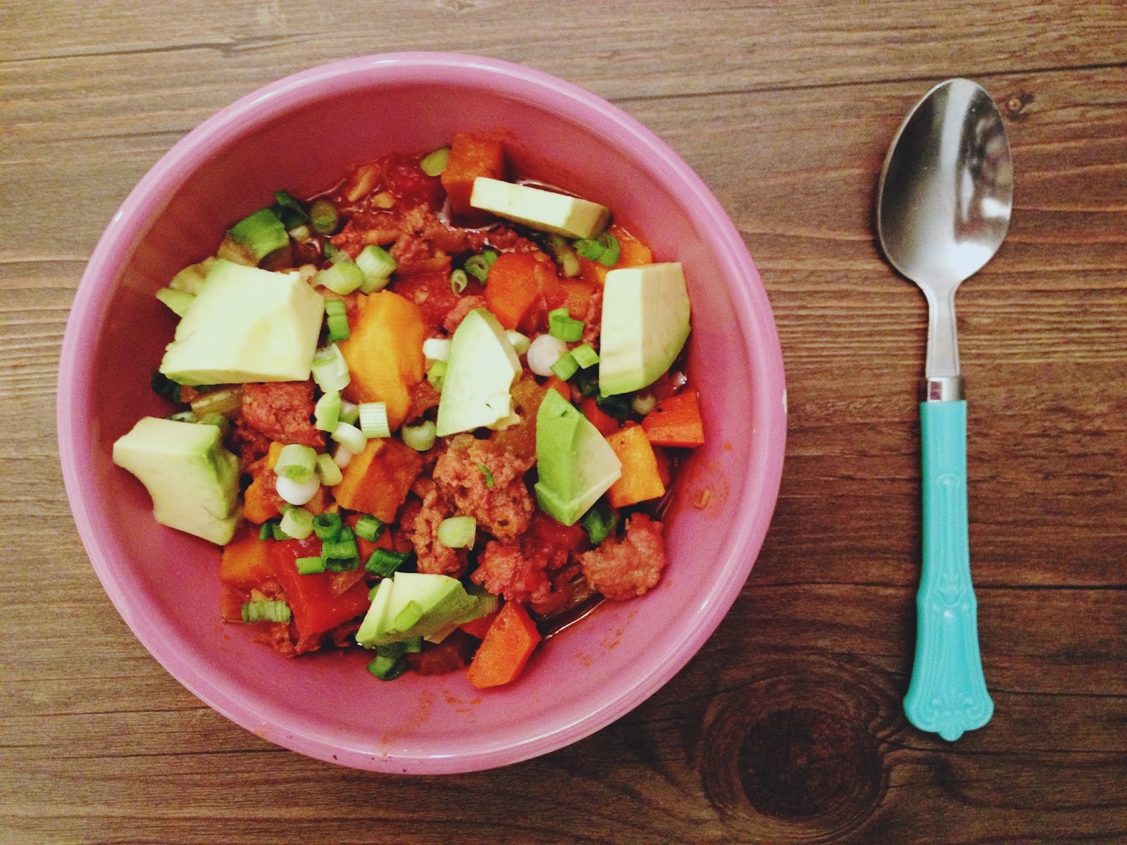 chili - beef, sweet potato, squash & tomatoes topped with avocado & green onion