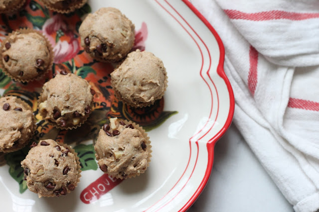 This is my "let me down gently" snack for when I'm trying to get off eating four boxes of girl scout cookies in one weekend. I call these muffins semi-healthy because they're made with whole wheat, coconut oil, dark chocolate and minimal sugar. However, they do contain eggs, milk and well... sugar. Long story short they're probably better for you than girl scout cookies but they're no vegan rabbit food either. They also have a habit of disappearing mere moments after exiting the oven, they're that good.